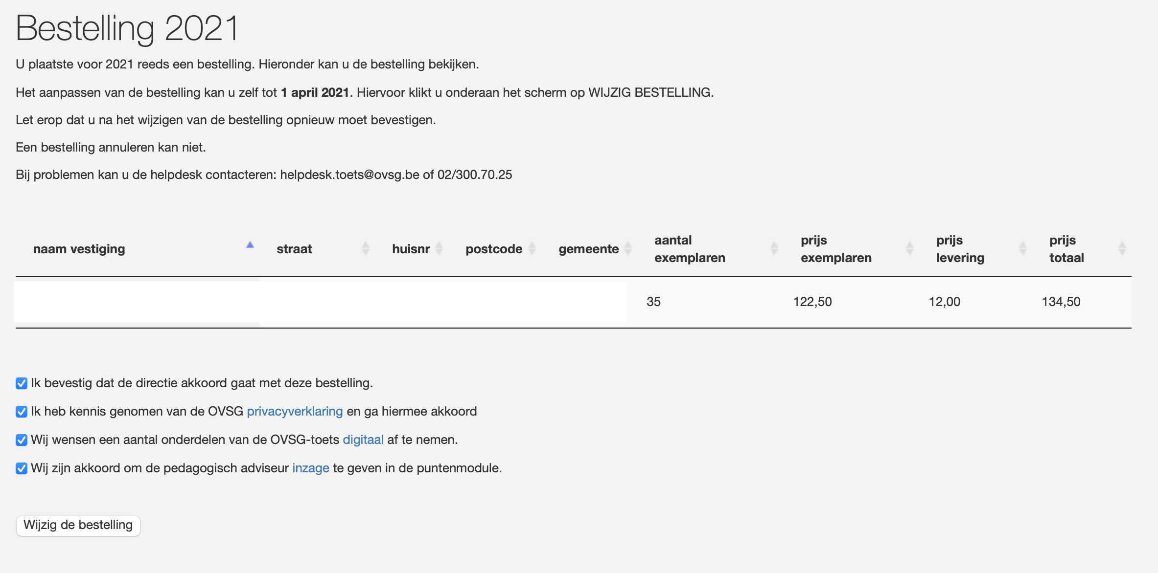 Tot 1 april kan je zelf de bestelling wijzigen. Hiervoor gaat de schoolbeheerder of secretariaatsmedewerker naar het beheerscherm van de bestellingen. Kies voor Wijzig bestelling. Vergeet niet om achteraf de bestelling terug te bevestigen en akkoord te gaan met de voorwaarden.